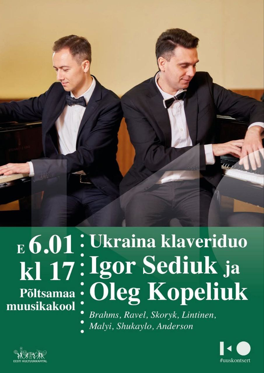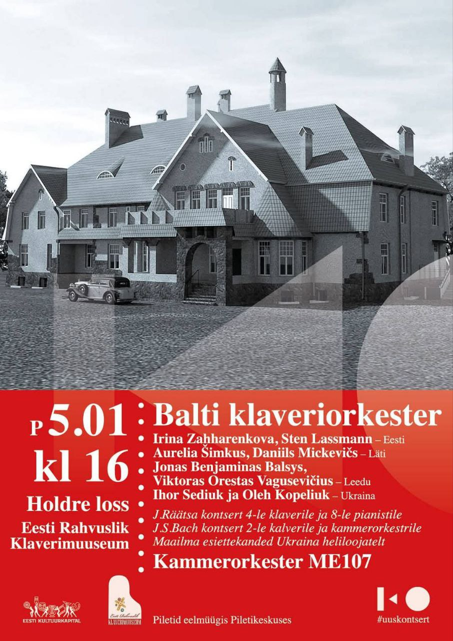 Aeg mõelda ühele suurele kontserdile, mis peab teoks saama pühapäeval 5.jaanuaril. Kolmandat korda saab kokku Balti klaveriorkester, seekord taas 8 pianistiga ehk 16 käega neljal klaveril. Esinejate nimed on all posteril. Eriliseks teeb seekordne kokkusaamine Ukraina suurepärase klaveriduo osalemine. Oleg ja Igor tulevad otse Harkivist ja toovad kaasa 2 Ukraina helilooja uudisteosed 16 pianistikäele, kirjutatud spetsiaalselt selleks kontserdiks. Aga ka ülipõnev Jaan Räätsa kontsert ja muidugi Irina ja Steni ning Kammerorkester ME107 solistide esituses J.S.Bachi kontsert kahele klaverile. Saalis on kohti vaid 100, need on alati olnud väljamüüdud- seega kiirustagem. Ilus automatk maalilisse loodusesse koos haarava kontserdiga klaveripeol! www.uuskontsert.ee