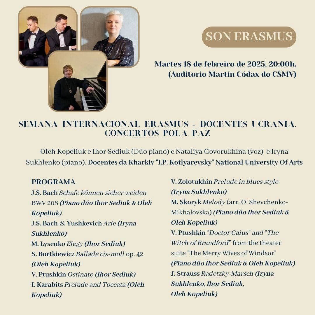 Vi får njuta av framträdanden av pianisterna Ihor Sediuk och Oleh Kopeliuk, båda professorer vid Kharkivs Musikakademi och välkända ukrainska pianister. De har turnerat i ett flertal europeiska länder, bl.a. Polen, Belgien, Tjeckien, Frankrike, Italien, Spanien och Kroatien.
