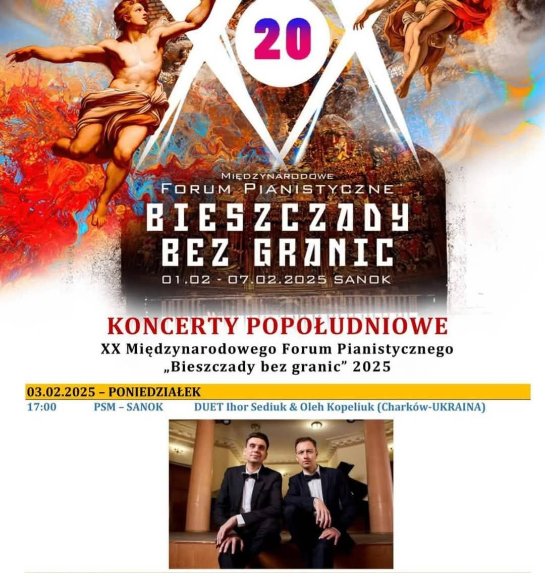 3 лютого 2025 року сольний концерт в межах ХХ Міжнародного фортепіанного форуму «BIESZCZADY BEZ GRANIC» в місті Сянок (Польща)В програмі- твори українських та західноєвропейських композиторів для фортепіано в 4 руки та двох фортепіано.