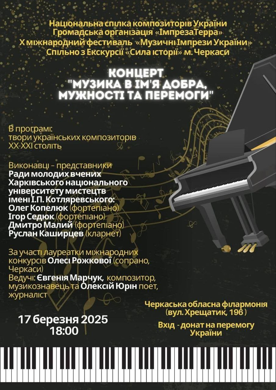 17 березня 2025 року в Концертній Залі Черкаської обласної філармонії Концерт Ради молодих вчених Харківського національного університету мистецтв імені І.П.Котляревського "Музика в ім'я добра мужності та перемоги" в межах Х Міжнародного музичного фестивалю "Музичні Імпрези України".